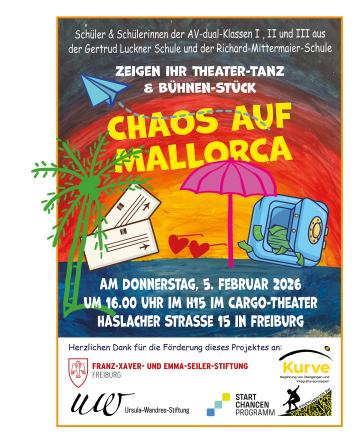 Einen wilden Ritt legen derzeit etwa 30 Schüler*innen aus drei AV-Dualklassen der Gertrud Luckner und der Richard Mittermaierschule aufs Parkett. In nur 9 Tagen wird eine Geschichte entwickelt, ein Bühnenbild gebaut, Theater- und Tanzperformances choreografiert und einstudiert. Am Donnerstag, den 5. Februar um 16 Uhr heißt es dann im Cargo Theater "Bühne frei" für "Chaos auf Mallorca!". Wie immer steht am Anfang eine große Gruppe junger Menschen mit einem interdisziplinären Künstler*innenteam vor der herausfordernden und spannenden Aufgabe, ein Stück aus dem Nichts zu entwickeln und es auf die Bühne zu bringen. Und wie jedes Mal sind wir immer wieder total begeistert und beeindruckt, was in so kurzer Zeit alles möglich wird, wenn sich das kreative Potenzial der Jugendlichen frei entfalten darf, wenn die eigene Stimme, der eigene Tanz / die eigene Bewegung und die eigenen Ideen für ein Bühnenbild willkommen sind und sich zeigen darf. Wer Lust und Zeit hat, sich das kleine Spektakel anzusehen, ist herzlich eingeladen, am Donnerstag, den 5. Februar ab 16 Uhr ins Cargotheater zu kommen und sich auf eine besondere Reise auf Mallorca mitnehmen zu lassen...