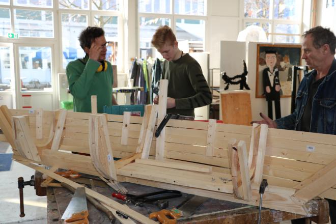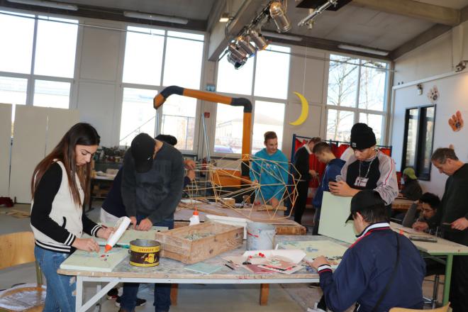 Einmal in der Woche nutzt die Berufseinstiegsklasse der Friedrich-Weinbrenner-Schule mit ca 20 Schülerinnen und Schüler die Kubus³ Projektwerkstatt, um sich künstlerisch und handwerklich mit einem selbst gewählten Thema zu beschäftigen. Die persönliche Entwicklung der jungen Menschen kann und soll durch künstlerische und handwerkliche Aktivitäten angeregt werden. Besonders die Jugendlichen der berufsvorbereitenden Klassen, die an der Schwelle ins Berufsleben sthen, profitieren von diesem vielfältigen Angebot. Sie können sich an verschiedensten Materialien ausprobieren und dabei eigene Interessenund Kompetenzen auf kreative und praxisorientierte Weise entdecken und erfahren. Diese Vorerfahrungen fördern eine passende und an den Interessen und Fähigkeiten orientierte Berufswahl.