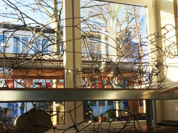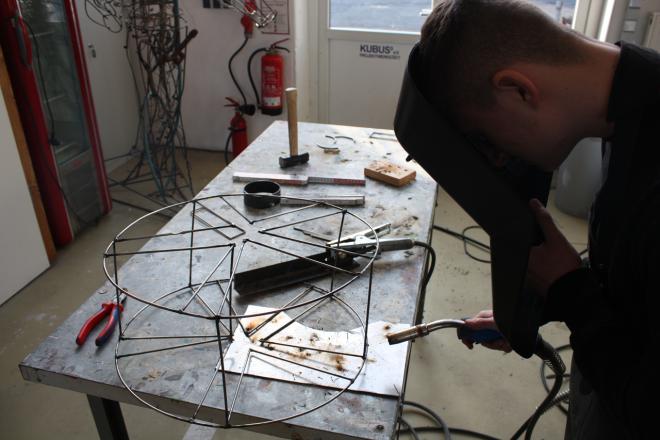 Gegenstand oder mit einer Erinnerung an wichtige Begleiter in der eigenen Kindheit künstlerisch auseinanderzusetzen. Die unterschiedlichen Bildelemente wurden dann mittels Bohrungen und einem geschmiedeteten Scharnier zu einem großen Buch zusammengearbeitet. Im zweiten Teil ging es darum, den Gegenstand bzw. das Motiv in eine Skulptur - also dreidimensional - umzusetzen. Da das Interesse der jungen Männer bei der Materialauswahl auf den Werkstoff Metall lag, wurde entschieden, dass alle Motive aus Rundmetall über Flex- und Schweißarbeiten eine Form finden sollten. Für die Präsentation entstand dann die Idee, alle Objekte in eine große kubische Rahmenkonstruktion aufzuhängen. So entstand wie im ersten Teil des Projektes eine Gesamtarbeit aus vielen einzelnen Objekten. Im Rahmen einer kleinen Abschlussfeier werden die Ergebnise am 1. Februar 2019 in der Projektwerkstatt öffentlich gezeigt.