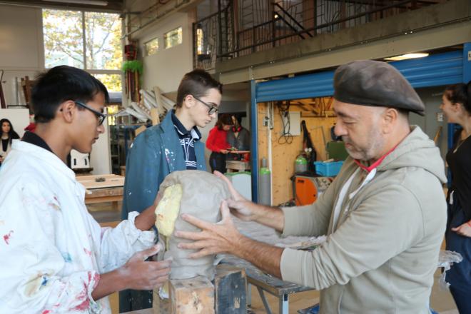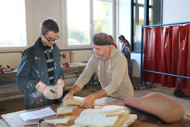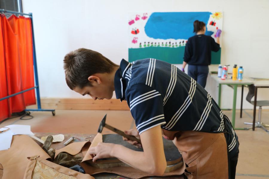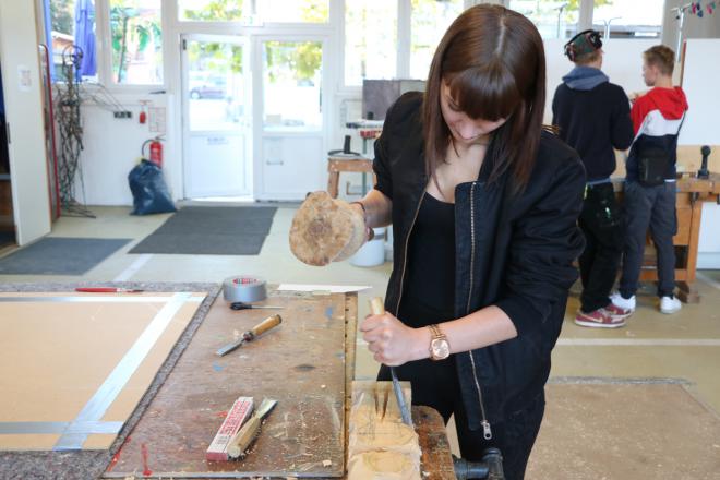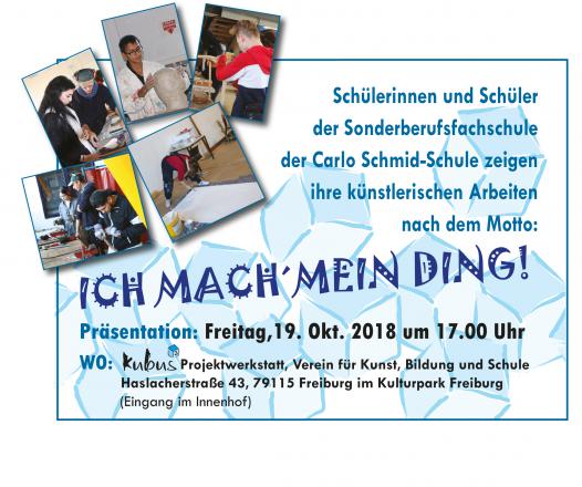 Vom 15. bis 19. Oktober 2018 setzten 13 Schüler*innen der Sonderberufsfachschule vom IB in der Kubus³ Projektwerkstatt mit unterschiedlichesten Materialien und begleitet von 3 Künstlern ihre Idee in eine ausstellungsreife Arbeit um. Das Motto „Ich mach´ mein Ding“ beschreibt sprichwörtlich den Kerngedanken dieser Arbeit, in der es immer wieder darum ging, die eigenen und persönlichen Ideen der Schüler*innen herauszukitzeln und mit der Unterstützung von Künstlern die Möglichkeit zu schaffen, diese zu realisieren. So entstanden im Laufe der Woche 13 authentische und sehenswerte Arbeiten (Malerei, Skulptur, Tonarbeit, Installation, Möbelbau), die mit der Biografie und / oder (aktuellen) Themen der Schüler*innen in Verbindung gebracht werden konnten. Schön war es zu erleben, das jede und jeder Schüler*in bei der abschließenden Präsentation hinter seinem Werk stand und den Gästen der Vernissage erklärten, wie sie auf ihre Idee gekommen sind und wie sich ihre Arbeit in der Woche entwickelt hat. Sowohl die Schwierigkeiten als auch die „Hochs und Tiefs“ im künstlerischen Prozess wurden von den Jugendlichen lebhaft erzählt.