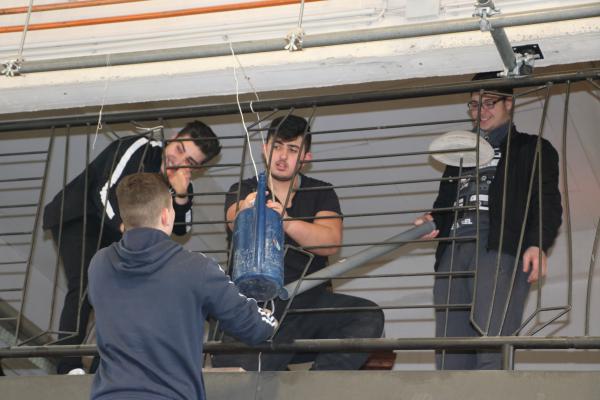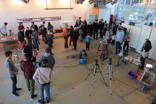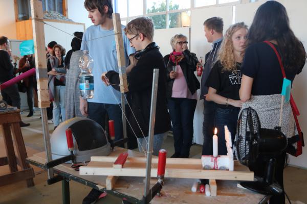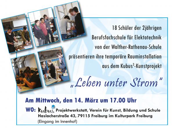 Der Titel "Leben unter Strom" und ein Filmausschnitt über die Installationsskünstler Fischli&Weiss inspirierte 18 Schüler der Berufsfachschule für Elektrotechnik dazu, in drei Tagen eine temporäre Rauminstallation zu entwerfen und zu bauen. Die einzelnen Teile bestanden aus Fundstücken aus der Werkstatt, aus Alltagsgegenständen und anderen Dingen, die aufgrund ihrer Eigenschaft oder Anordnung in einer ganz bestimmten Reihe Ursache und Wirkung sind und Impulse verschiedenster Art weiter zu geben. In Kleingruppen wurden erste Ideen entwickelt und überlegt, wie eine Kettenreaktion über eine längere Strecke mit verschiedenen Impulsen und Gegenständen entstehen könnte. Schon zu Beginn rauchten die Köpfe und es sprudelten viele witzige Ideen aus den Schülern heraus und motivierte alle dazu, an ihrer Idee zu feilen und sie immer wieder auszuprobieren - bis es klappte oder auch umdisponiert werden musste. Die Schüler zeigten außer viel Grips und Kreativität vor allem auch "Biss", Ausdauer und Teamgeist beim Experimentieren und Finden von Lösungen. Die Installation wirkte vielleicht auf den ersten Blick wie ein großes „Durcheinander“ und erst bei näherem Betrachten bzw. bei der Präsentation des "Ablaufs"offenbarte sich die komplexe, künstlerische Arbeit, die dahinter steckte. Nicht nur beim Tüfteln und Ideen ausprobieren waren die Schüler motiviert und kreativ: Auch kulinarisch war die Gruppe sehr einfallsreich und mit Unterstützung der Klassenlehrerin und dem Kubusteam wurde in den 3 Tagen sehr fein und lecker für alle gekocht. Ein kulinarischer Gaumenschmaus wurde von drei afghanischen Schüler für alle gekocht. Zur Präsentation am Ende des Projektes kamen intererssierte Eltern, Freunde LehrerInnen sowie das Schulleitungsteam. Die Zuschauer verfolgten gespannt die Präsentation, die aus zwei Installationen bestand und insgesamt zweimal Mal vorgeführt wurde.
