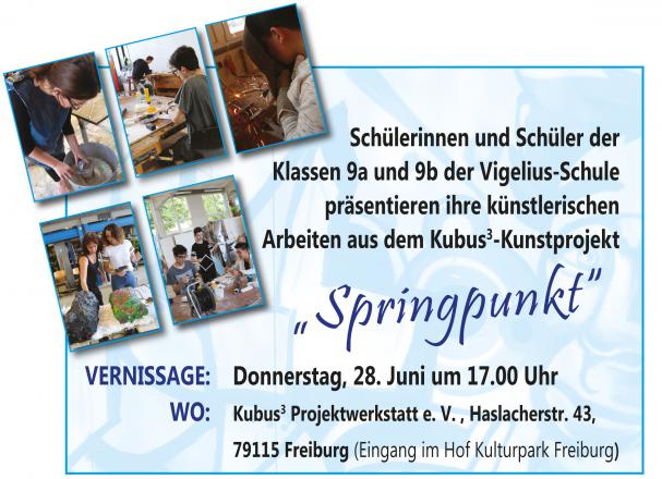 Das Motto SPRINGPUNKT wurde von den Jugendlichen auf unterschiedlichste Weise interpretiert. Die originellen Ideen der Schülerinnen und Schülern wurden im Laufe eines Schulhalbjahres zu einem ausstellungsreifen Objekt / Malerei / Skulptur verwirklicht. Auf der gemeinsamen Vernissage am 28. Juni präsentieren die beiden Klassen Ihre entstandenen Werke. Begleitet wurden die Schüler von der Künstlerin Jikke Ligteringen und dem Künstler Alfonso Lipardi. Man darf jetzt schon gespannt sein, auf die verrschiedenen künstlerischen Interpretationen des Mottos "Springpunkt".